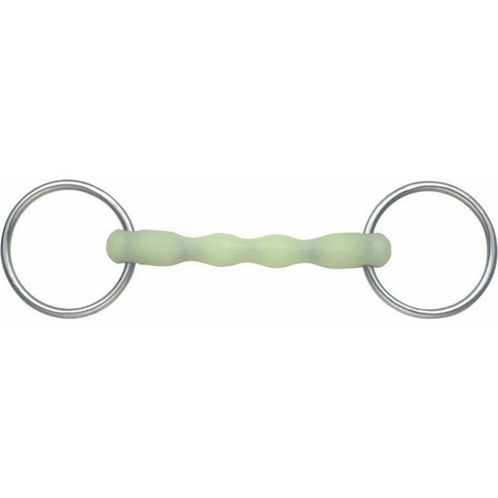 This EquiKind loose ring allows movement in the horse’s mouth whilst the ripples on the mouthpiece add a little pressure for extra control. Apple flavoured, very mild and perfect for mouthing young horses. Mouthpiece thickness: 18mm. Cheek height: 65mm. The EquiKind mouthpiece has the benefit of being lighter and more flexible. Particularly suitable for young, sensitive horses as they are kind on the mouth. The apple flavour makes them palatable and therefore easily accepted. Stainless steel is used due to it being durable, easy to clean and resistance to rust.