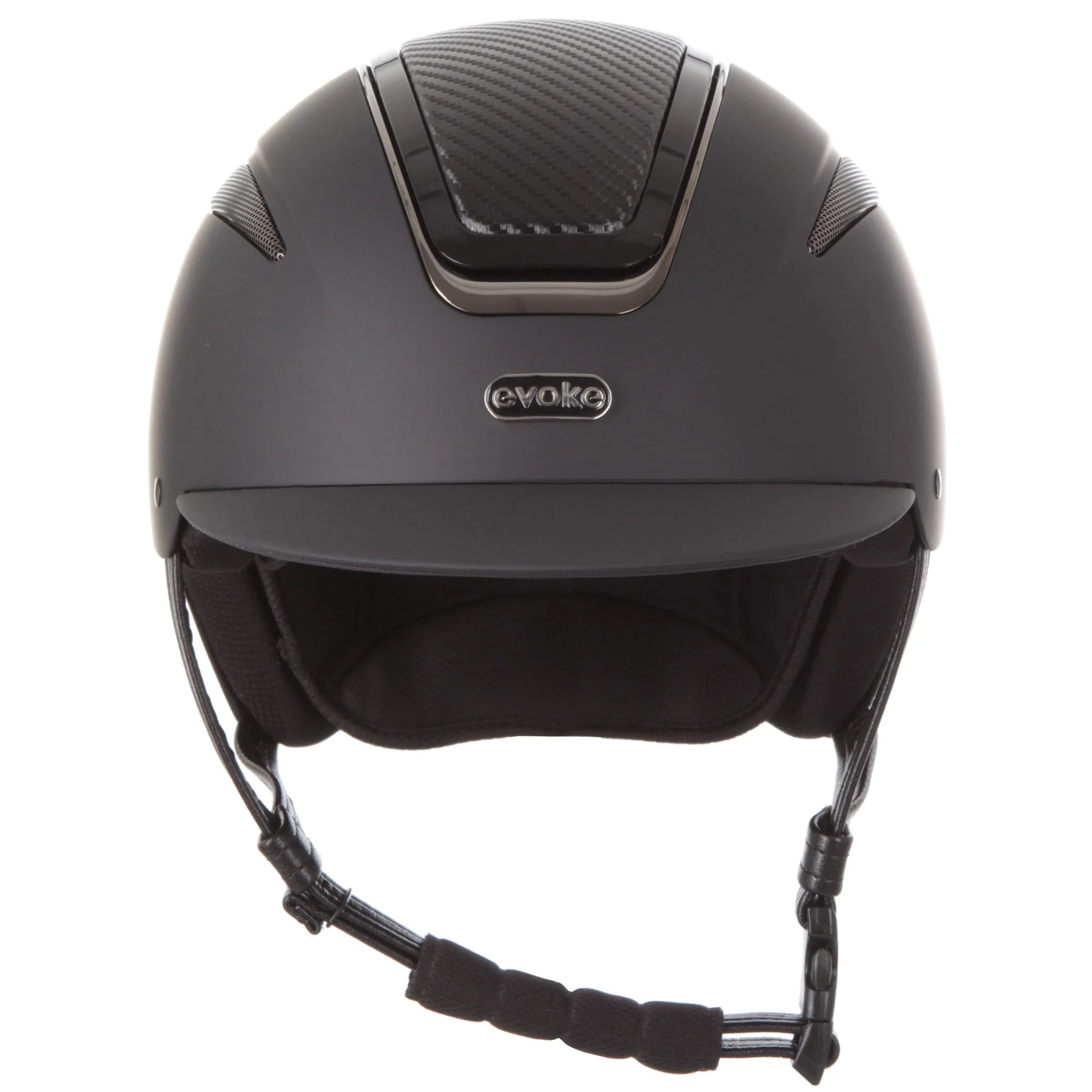 Introducing the show stopping Callisto Wide peaked riding helmet in a matt black finish with high shine silver & black vent, beautiful black crystal centre panel, complimenting chrome & black evoke branding. A pinnacle of style, safety and sophistication.- Conforms to PAS 015: 2011 Standard; VG1; EN 1384 2023