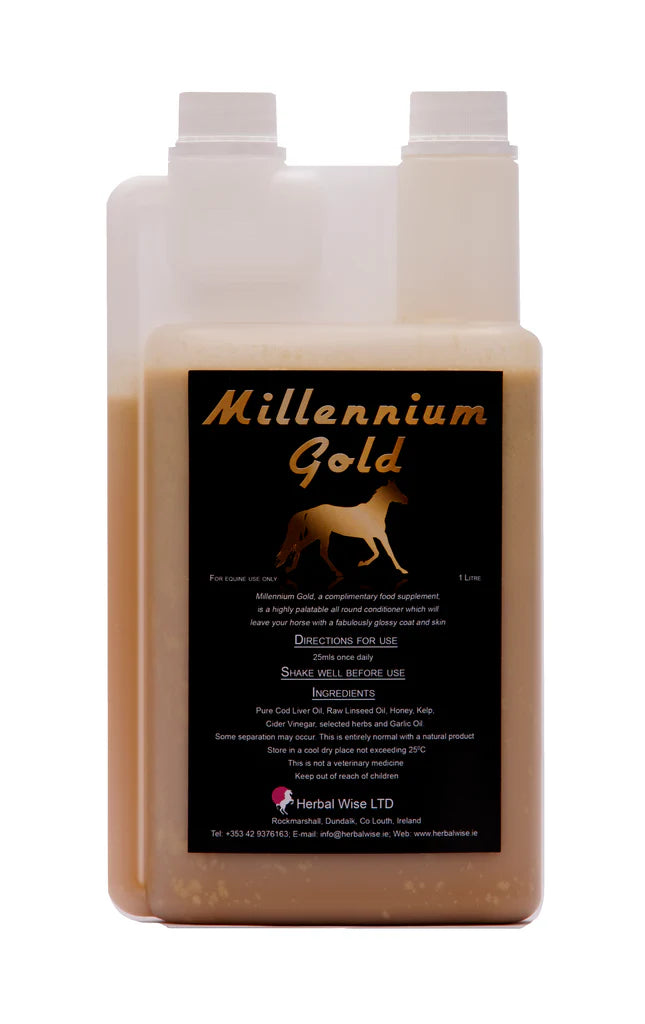 Millennium Gold is a unique blend of oils, honey and macerated herbs which supplies the horse with wonderful natural nutrition. This includes omega oils leaving them with a fabulous coat and a fantastic aura of health.