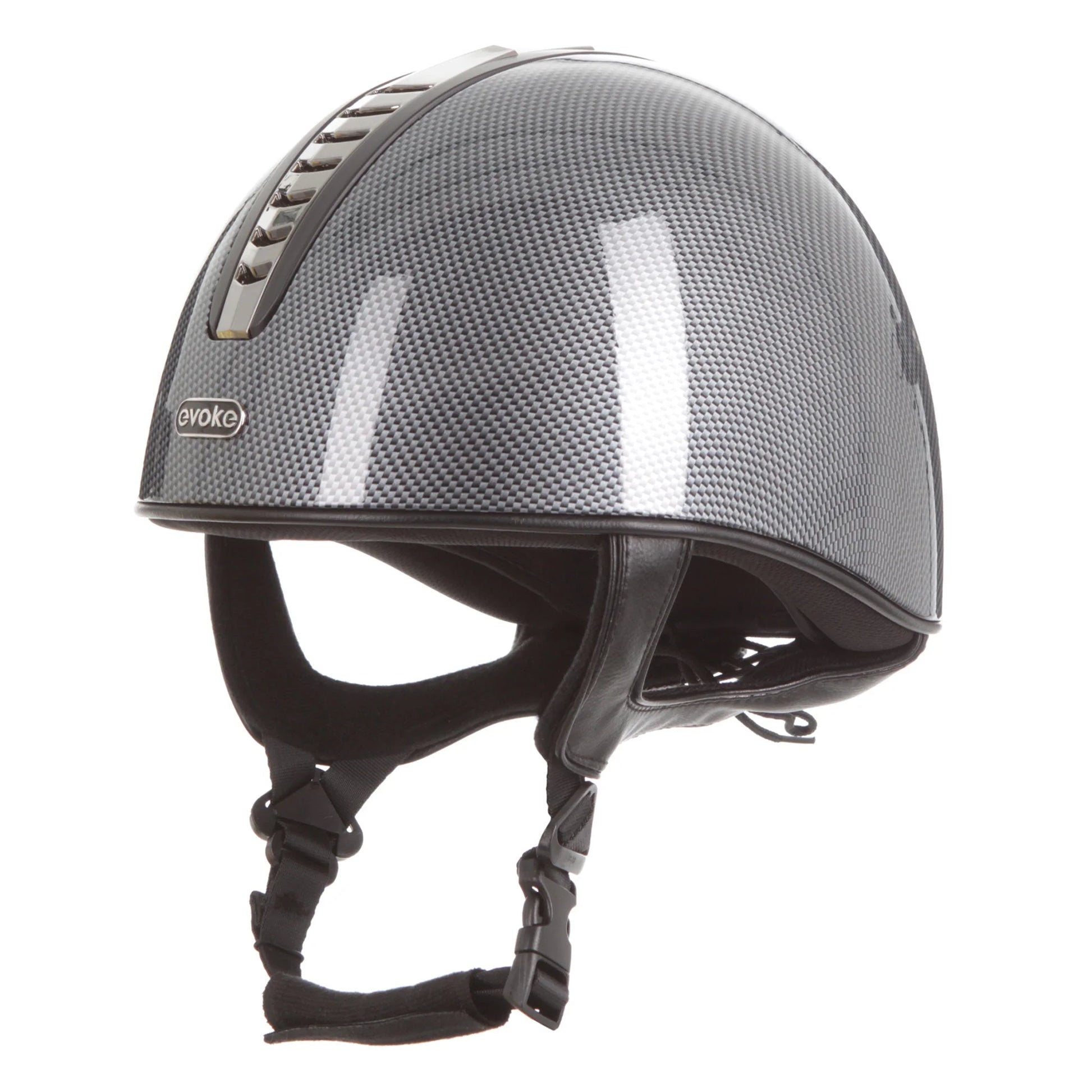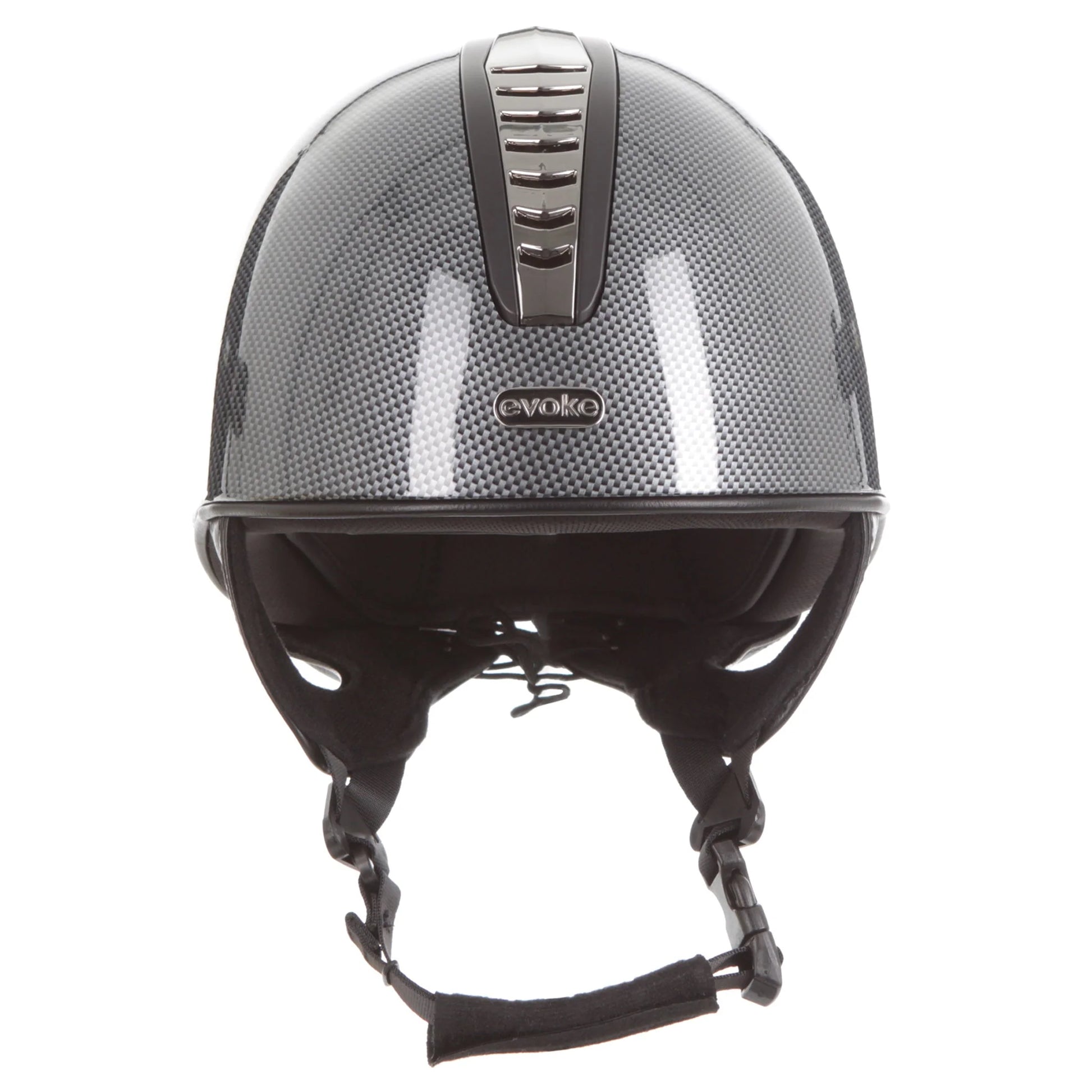 Introducing the stellar Orion Jockey Skull. Sporting a high shine carbon paint finish, gunmetal and black vent and complementary black harness. A gunmetal ‘evoke’ branded logo at the forehead completes the look.- Conforms to PAS 015: 2011 Standard; VG1; EN 1384 2023