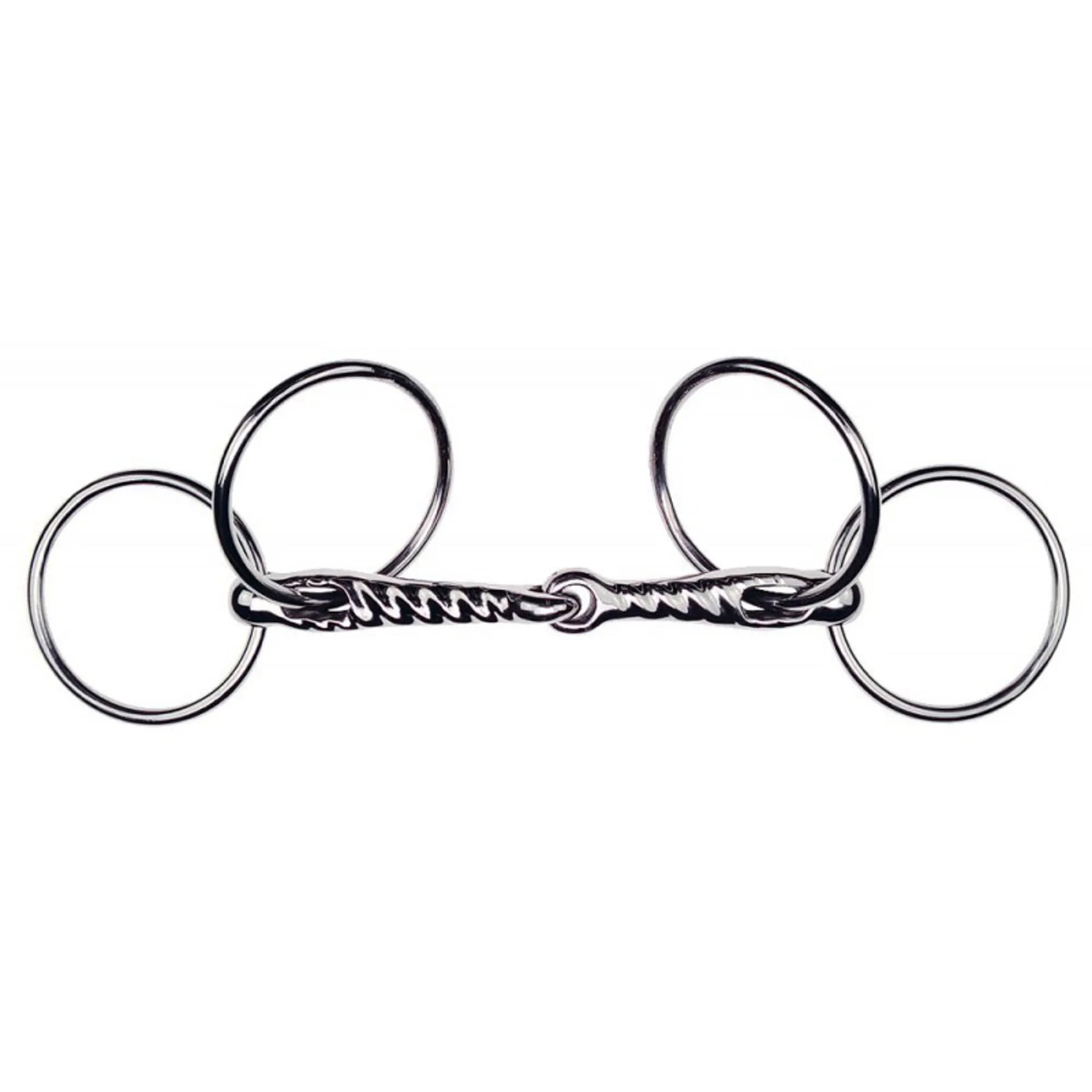 The Feeling Scourier Bit is made from stainless steel for durability. It features a twisted mouthpiece and has four rings, two of which attach to the cheek pieces, the other two the reins. This results in a severe squeezing on the horse’s face when the reins are pulled. This should only be used by experienced riders as it is very severe.