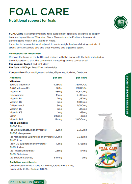 FOAL CARE is a complementary feed supplement specially designed to supply balanced quantities of vitamins. Trace Elements and a Prebiotic to maintain general good health and vitality in foals.