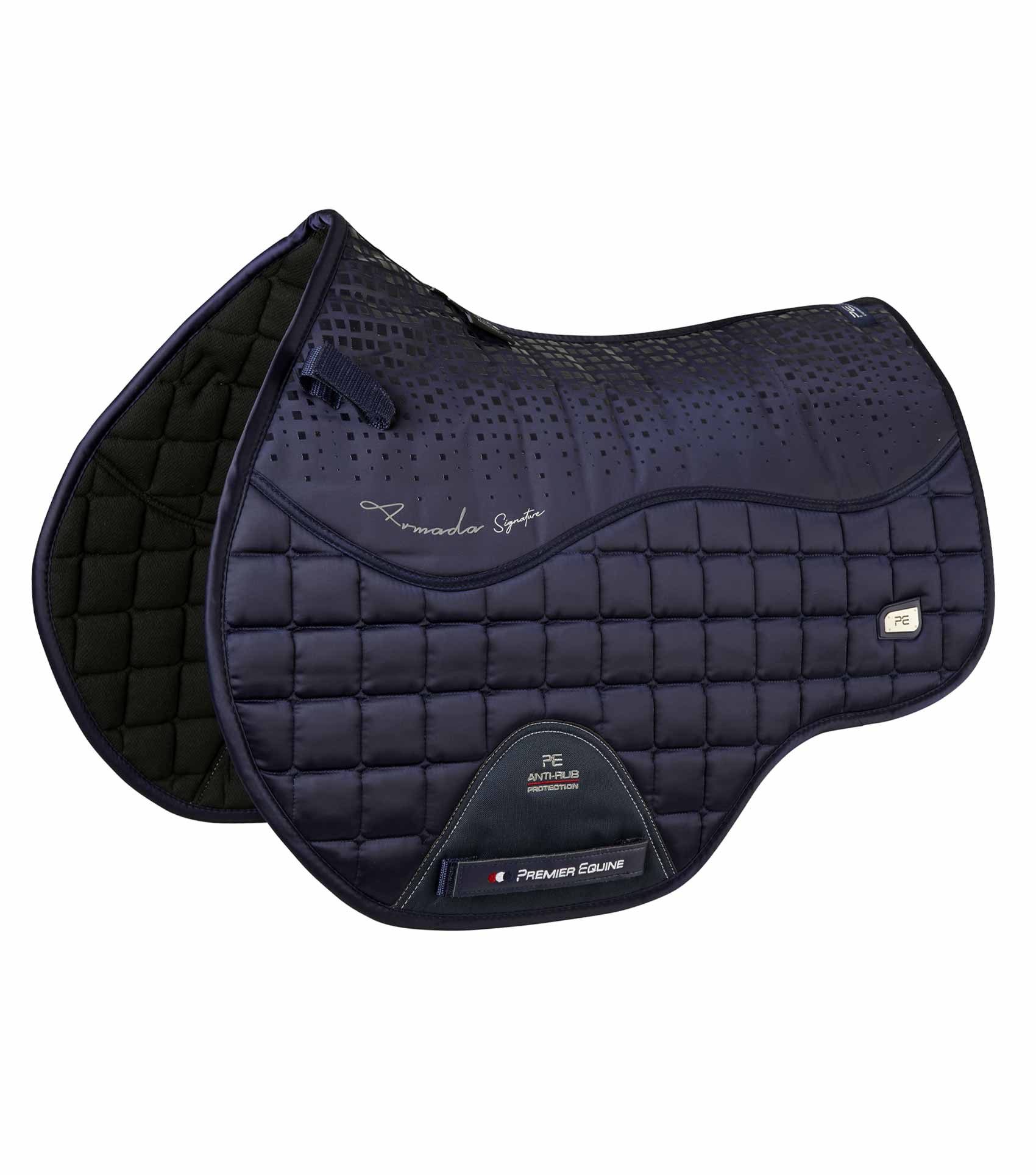 The Armada CC GP/Jump Square in Navy is a saddle pad designed with various technical features for the comfort of both the horse and rider. It includes: