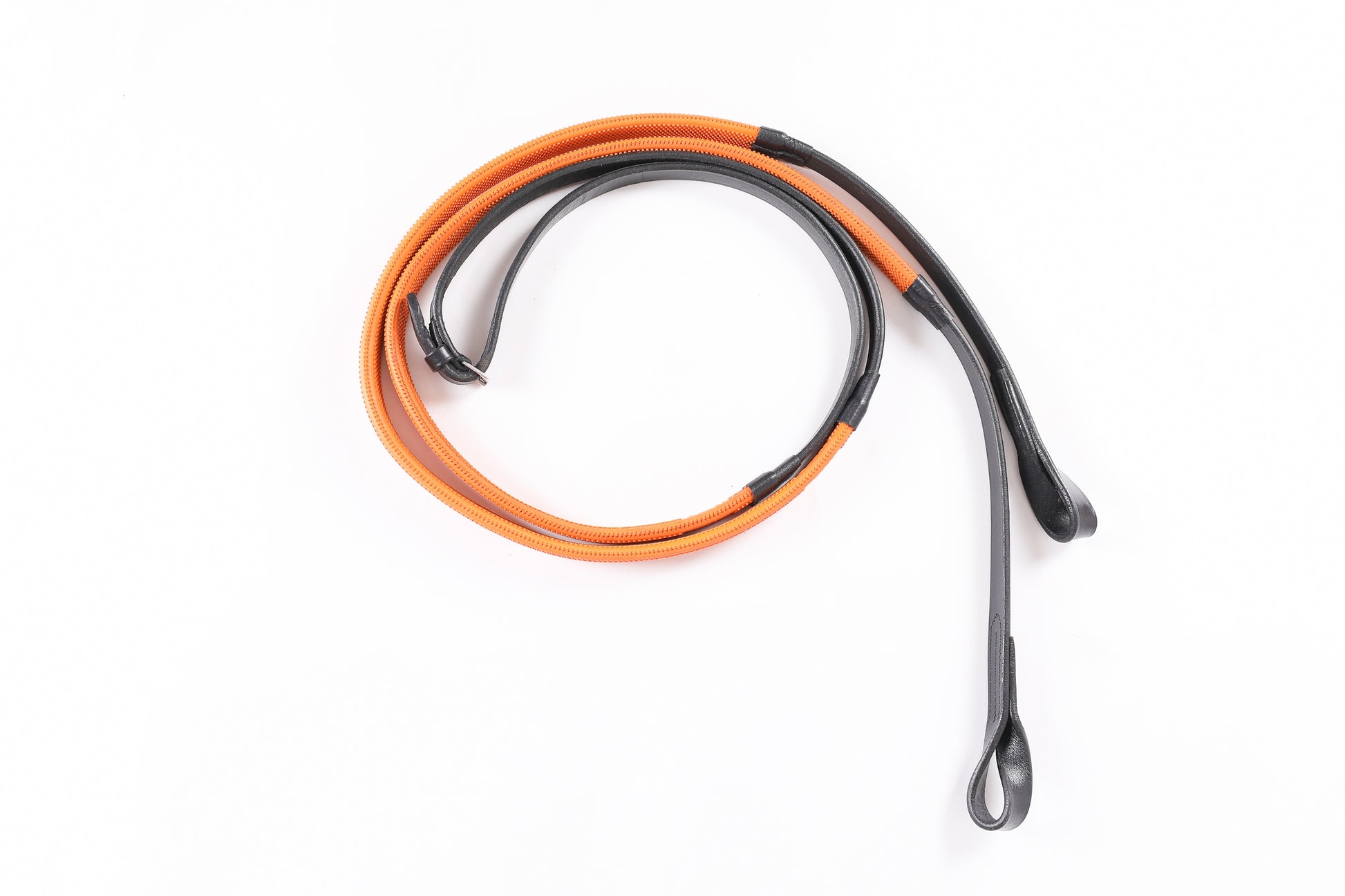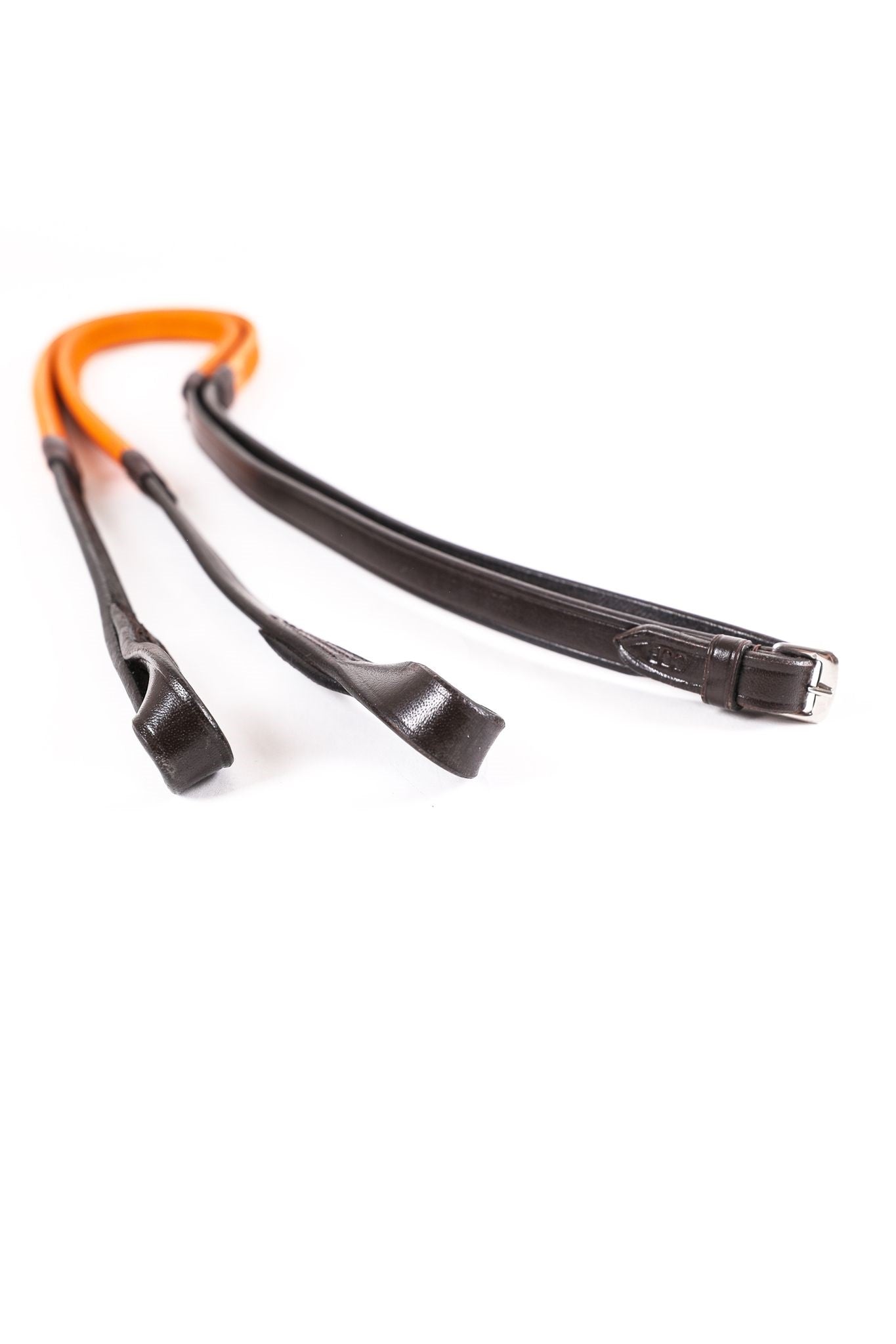 The reins are available in black or brown leather, and are part covered with flexible small pimple rubber grips. Grips available in a matching colour or orange