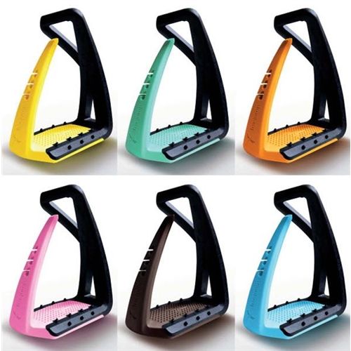 The flexible outside branch of these coloured stirrups is made from Elastollen and helps to ensure that the rider's foot is released in the event of a fall.