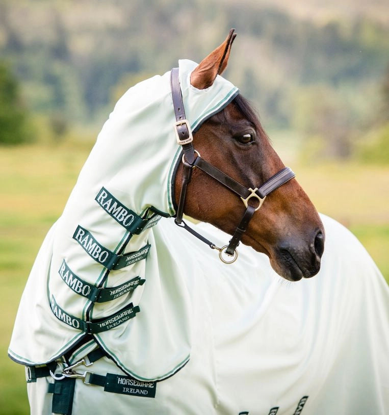 The Rambo® Hoody rug is our premium hoody rug designed to act as a trustworthy barrier against summer skin irritations, flies and UV rays. Made of a soft and very durable 1000D Polyester with close woven fabric so biting insects can’t get through. Top to tail maximum protection with extended belly coverage with Velcro closure and three cross surcingle’s that wrap around the body, a supersized tail flap and an integrated neck cover (non-removable) with shaped ear holes. This rug gives exceptional coverage during those warmer months, giving you peace of mind that your horse is comfortable and protected.