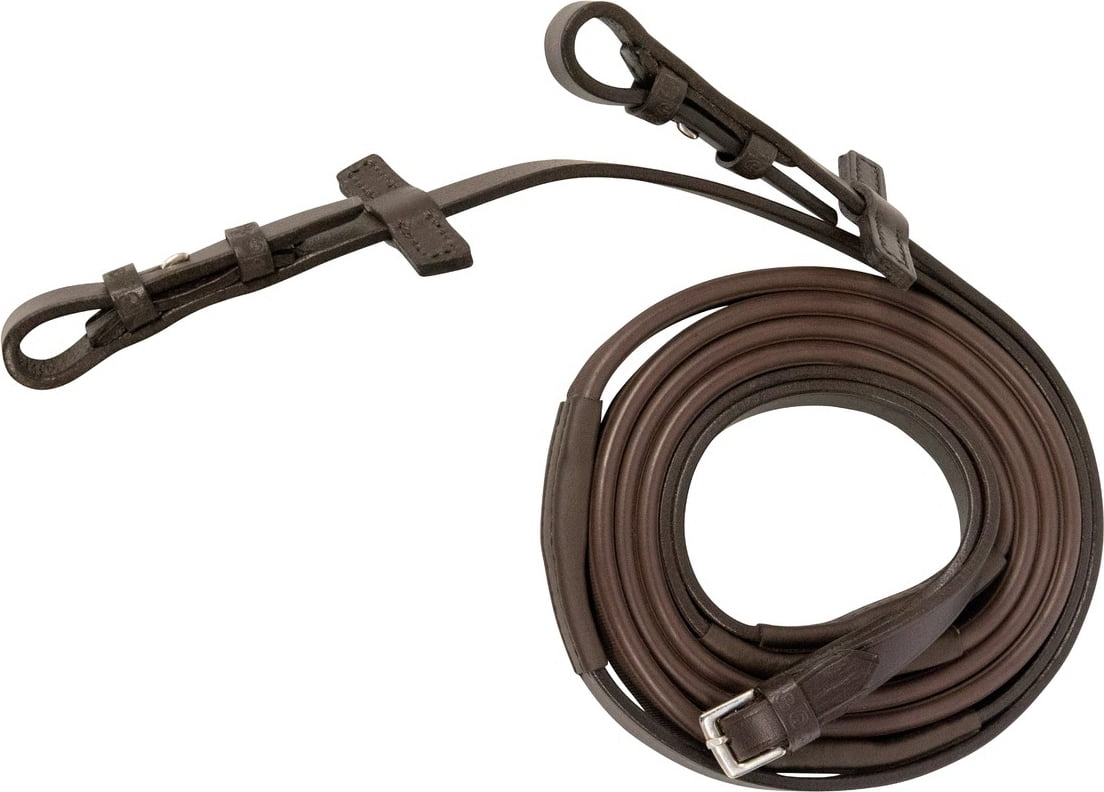 These simple RUBBER REINS with medium width lie well in your hands. The sturdy ring at the end is a good alternative to the traditional leather loop combined with a buckle and martingale stops become redundant.