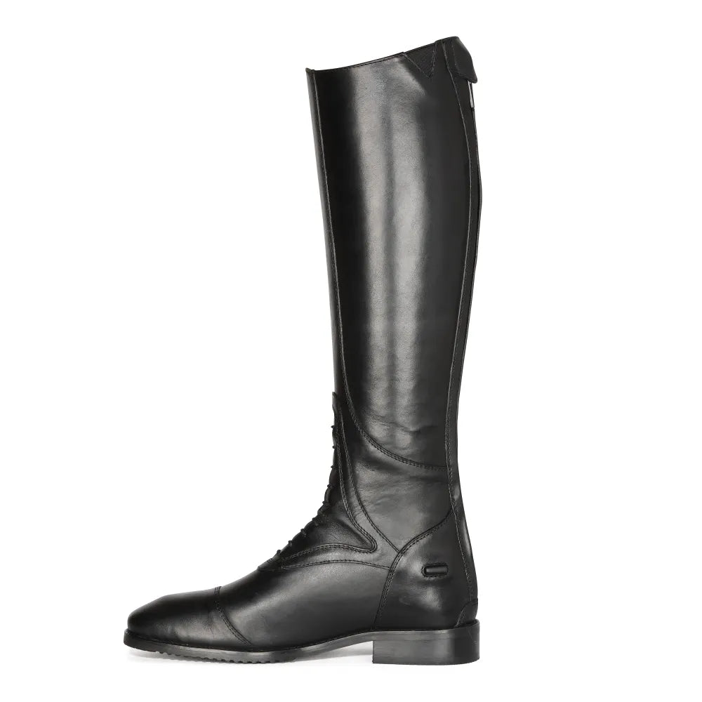 Classically styled and sculpted for advantage in shape-retaining leather, Tivoli offers the ambitious rider a timeless competition wardrobe essential. Full grain leather has a smart, smooth polished finish. The standard height leg gives a classy silhouette featuring antique silver monogram top tabs. The fit enhancing mock stretch lace panel and ergonomic UltraFit leg ensure a neat shape. The boot is fully lined in luxurious tan leather. Elegantly styled with a square toe, a refined heel guard and leather covered spur rests. The anti-fatigue RIDERELIEF+ insole creates comfort from the first wear. A low profile sole is ribbed for stirrup security whilst allowing a close contact feel. Key features: Premium shape retaining leather. Full grain with smooth finish. Full leather lining. UltraFit leg panel. YKK zip. Upper leather zip security tab. Leather grip spur rest. RIDERELIEF+ insole. Moretta composite outsole. Steel shanks. Supplied with inflatable boot trees.
