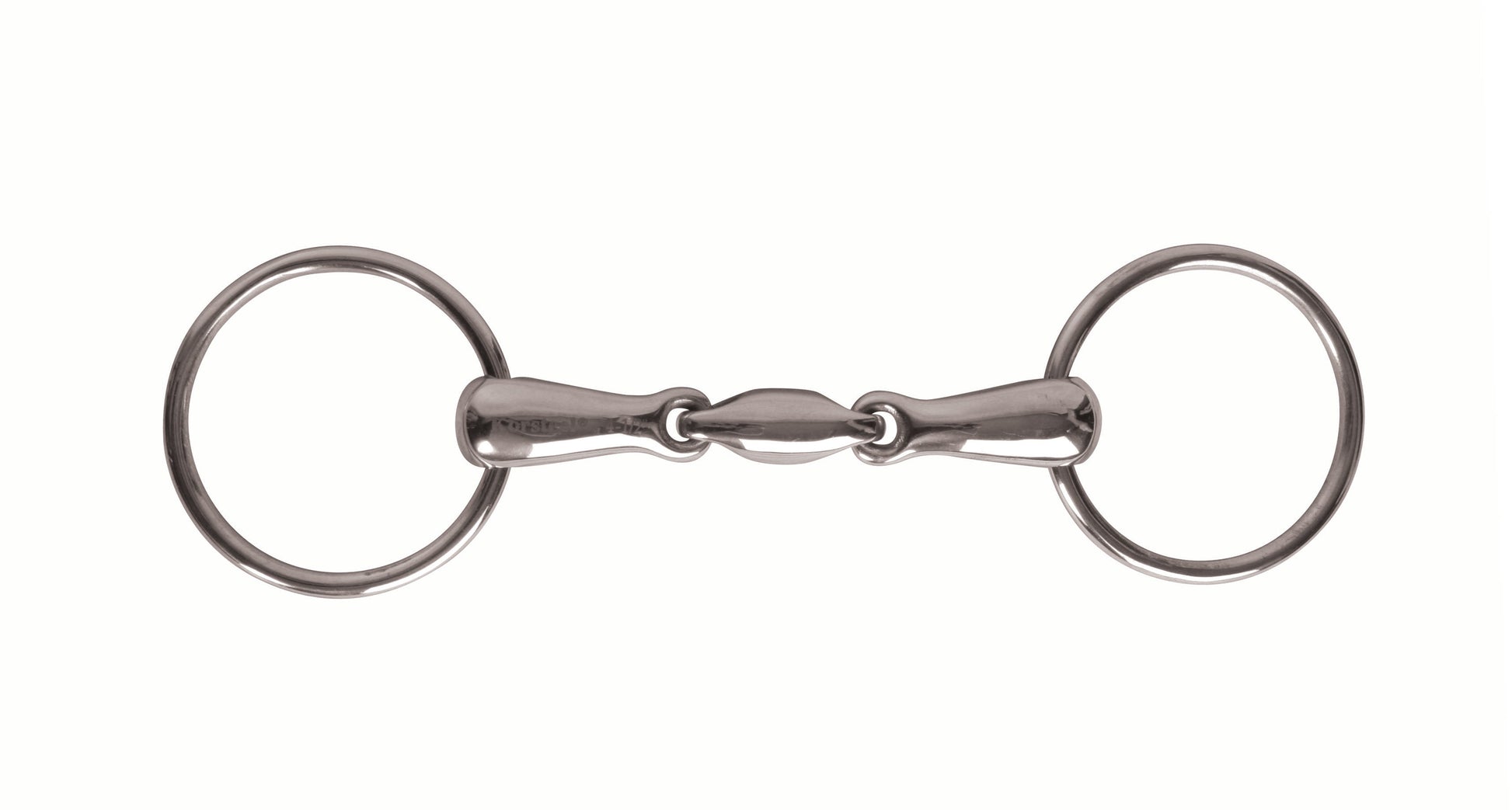 Curved bit to reduce the "nutcracker" action and to alleviate pressure on the tongue and bars of the mouth. Prevents contact with the roof of the horses mouth. Allows for effective communication between horse and rider whilst encouraging relaxation and salivation. A mobile bit which discourages fixing and leaning on the forehand. Mild bit designed to create less pressure than a standard French link., Curved bit to reduce the "nutcracker" action and to alleviate pressure on the tongue and bars of the mouth
