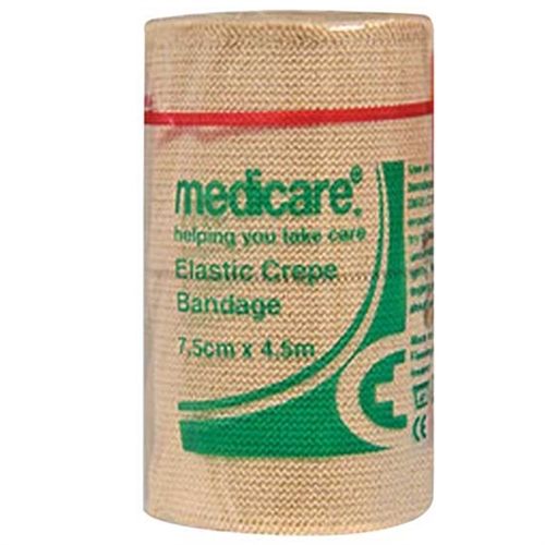 • Medicare 100% Cotton Crepe Bandage is used in the treatment of sprains, and strains and in other conditions in which light support is required • Great elasticity (elasticity may be lost during use but will be retored after washing in warm soapy water) • Can be washed and sterilised • Comes with clips • Size: 7.5cm x 4.5m Medicare crepe bandage for the first aid treatment of emergency injuries. Medicare 100% Cotton Crepe Bandage is used in the treatment of sprains and strains and in other conditions in which light support is required. The Medicare Cotton Crepe Bandage comes with special clips to secure bandage once desirable level of compression has been achieved. Because of the high quality of fabric, there is superb elasticity. In the case that some elasticity might be lost during use, it will be restored again after washing in warm soapy water. The bandage is very durable and versatile and can be washed and sterilised easily. The MEDICARE CREPE BANDAGE features a unique yellow guideline to facilitate correct over-lapping and alignment. This ensures that an even level of compression is provided. When can I use it? • For emergency aid treatment of sports and workplace accidents. • To support and immobilise the arm or leg following injuries. • To secure and compress dressings in place over open wounds. • Offers a medium level of compression How does it work? Medicare 100% Cotton Crepe Bandages conform easily to all body parts and are a first aid essential. They can be used to secure dressings in place over wounds, to immobilise arms and legs following fractures, or to compress injured areas to prevent swelling.