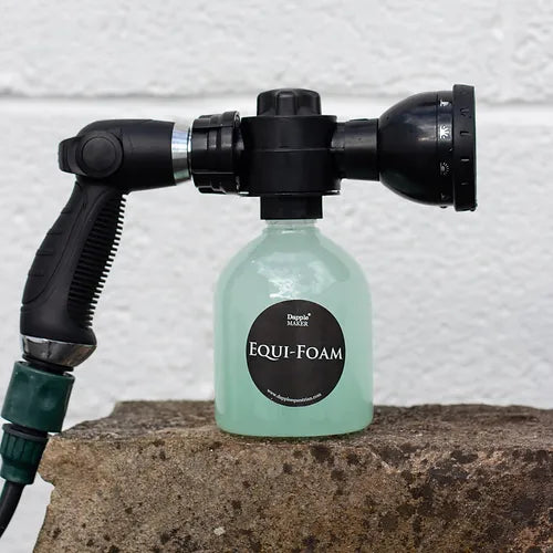 The Dapple Maker Equi-Foam is a must have for any horse owner. Just fill up the container with your favourite shampoo, connect it to any standard garden hose attachment and start washing! There is a water pressure adjustment and a dial to adjust the water/shampoo mix. You can even turn off the shampoo mix when it's time to rinse. The spray head also has numerous selections to change the type of spray or foaming. Make washing fun and easy, you can even use it on the dog or the car!