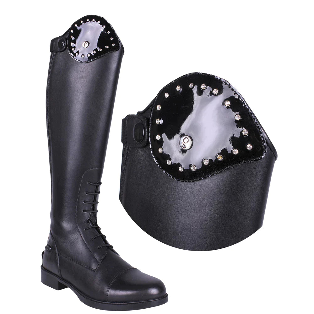 Personalise and style your riding boots to suit your style. Why not add some bling to your Romy riding boots with an exchangeable top from QHP. This Crystal black exchangeable top is made of patent leather with rhinestones along the border. There are a variety of fun and stylish exchangeable tops available so you can change choose the one to suit your mood