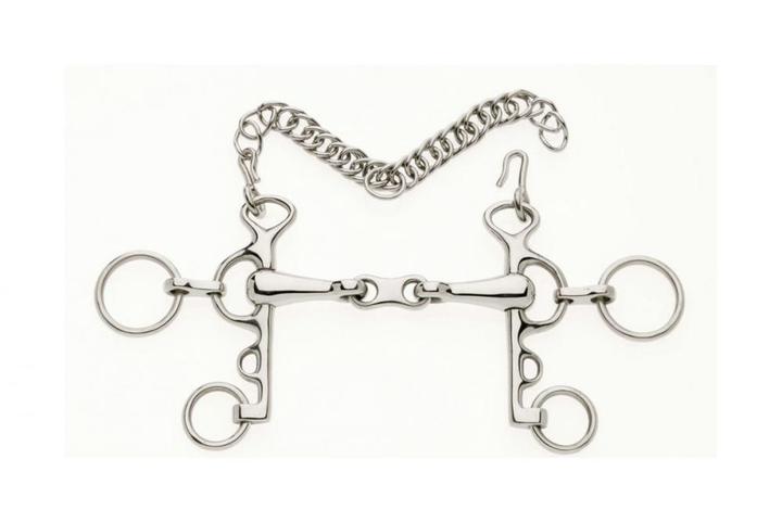 The Rugby Pelham is widely used in showing as an alternative to the Weymouth and bradoon. It gives the look of a double bridle as this bit has to be used with a double bridle which has an extra bradoon head slip, as you would have with a Weymouth and Bradoon, this bit also has to worn with two reins.The Rugby Pelham has an extra loose ring which is connected by a link on the snaffle ring, which is also supposed to give a more direct contact to the mouthpiece than that of a ‘normal pelham’.