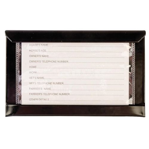 Displays horse details on printed card protected by plastic wallet. Holder is pre-galvanised steel and Stubbyfine coated . Card size 15x10cm. Weight: 0.33kg