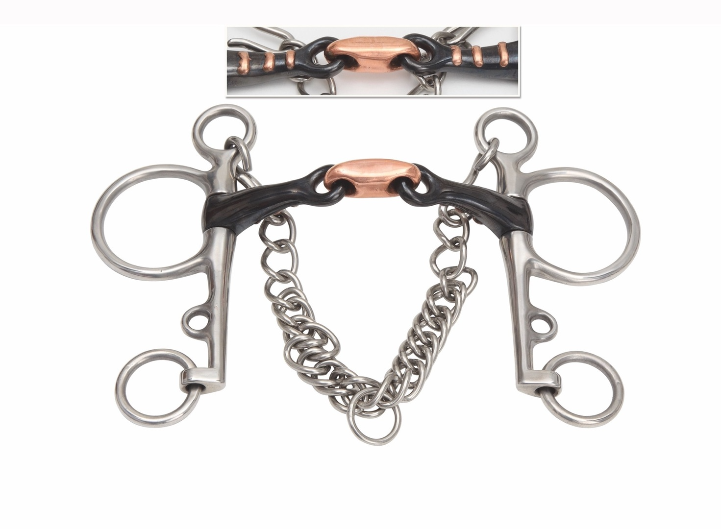 Pelhams work on the poll, corners, bars, tongue and chin groove. This bit will assist with control. The jointed mouthpiece will lessen the nutcracker action. The copper and sweet iron will encourage the horse to be softer in the mouth. Raised copper ribs help to prevent the horse taking too much of a hold. Mouthpiece thickness: 16mm. Cheek height: 135mm. Sweet iron mouthpieces are designed to oxidize to produce a sweet taste which helps with mouthing. The addition of copper to the mouth ensures the horse will not take up too much of a contact, ideal for horses that can take a hold. Stainless steel is used for the cheeks due to it being durable, easy to clean and resistance to rust.