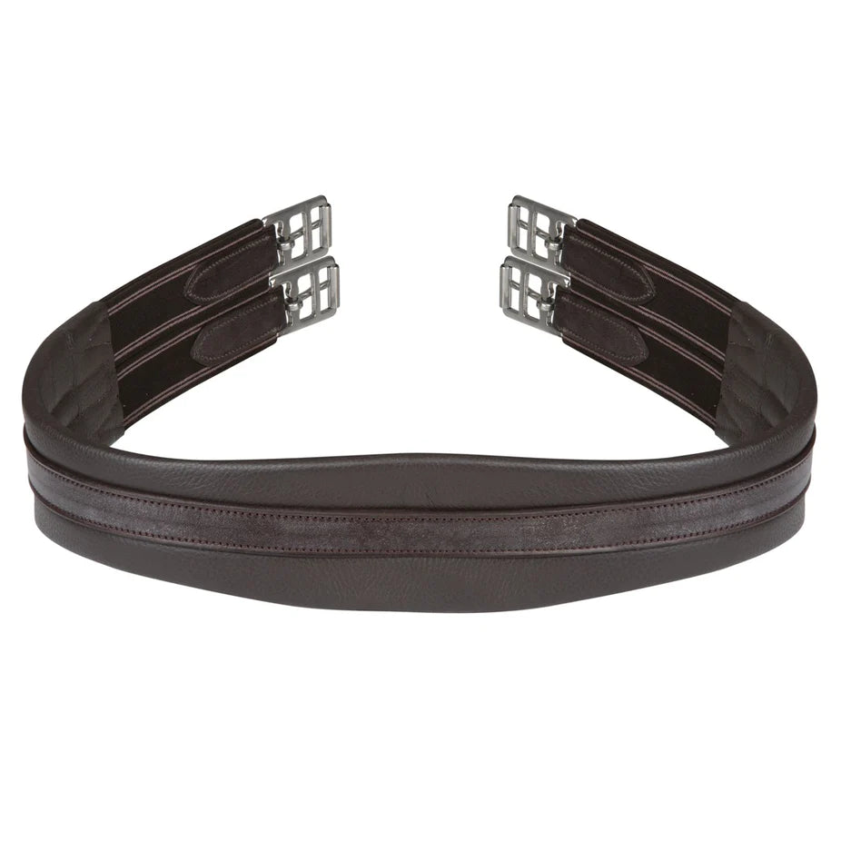The Velociti GARA cushioned leather girth provides a high level of comfort whilst still being strong and durable. The contoured shape enables freedom around the elbows whilst triple layer elastic inserts at both ends help alleviate pressure. Stainless steel roller buckles.