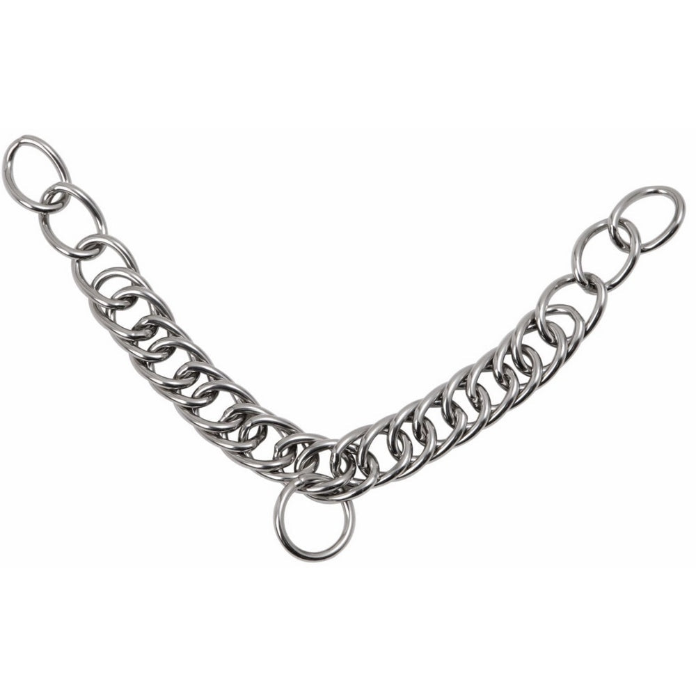 The curb chain applies pressure to the chin when engaged. The double links reduce the risk of pinching and allow the chain to sit more comfortably. Length: Pony (7), Cob/Full (9).