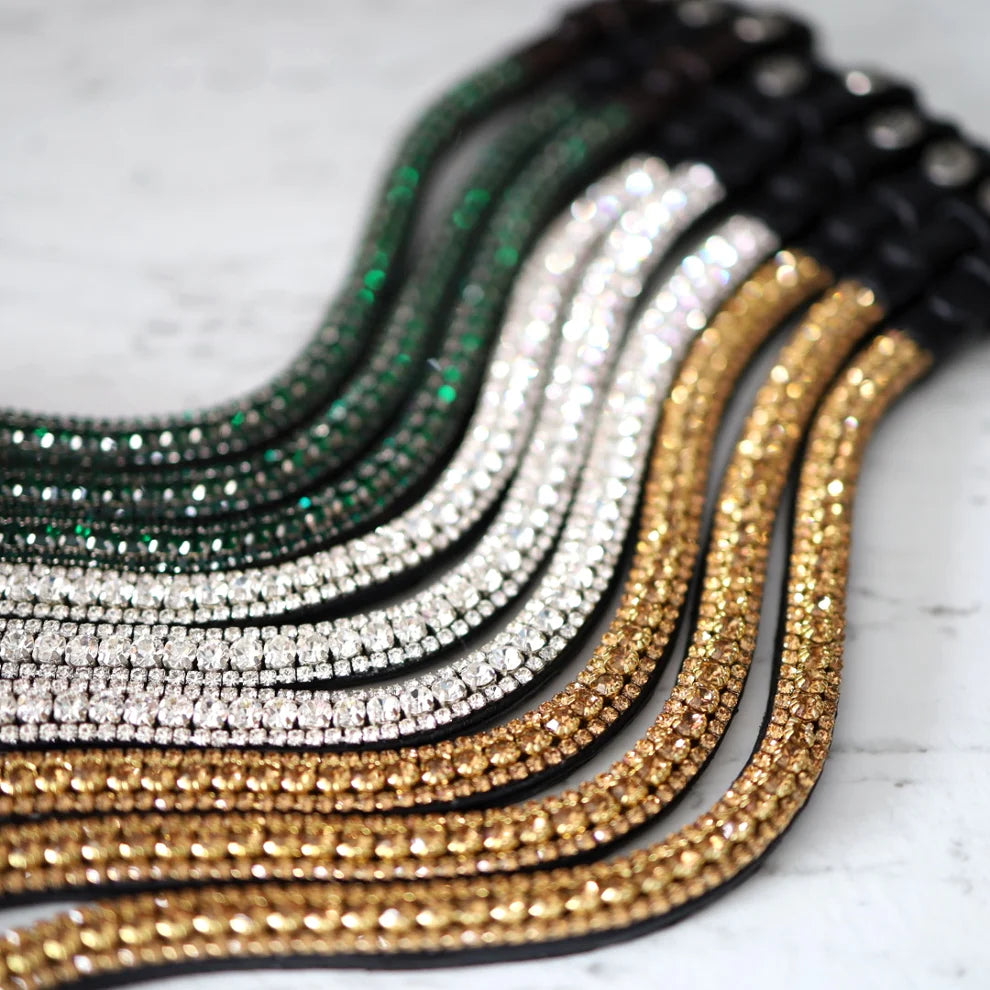 This striking shaped browband features dazzling sparkly dimante set in soft, durable leather, designed to add a touch of elegance to your horse's gear. Each browband is meticulously hand-stitched and lined with soft leather for added comfort and a polished appearance. The diamanté is securely double-stitched on both the top and bottom to enhance durability and prevent them from falling out. As Available in cob and full sizes.