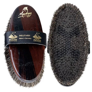 The shorter and stronger bristles are for a thorough cleaning effect, whilst the longer bristles remove dust and enhance the shine. This brush really locks into a soft coat and ensures that every dirt, sweat and dust is taken to the surface of the coat. A particularly strong horse hair mixture has been used for this brush. The border is edged with longer bristles.