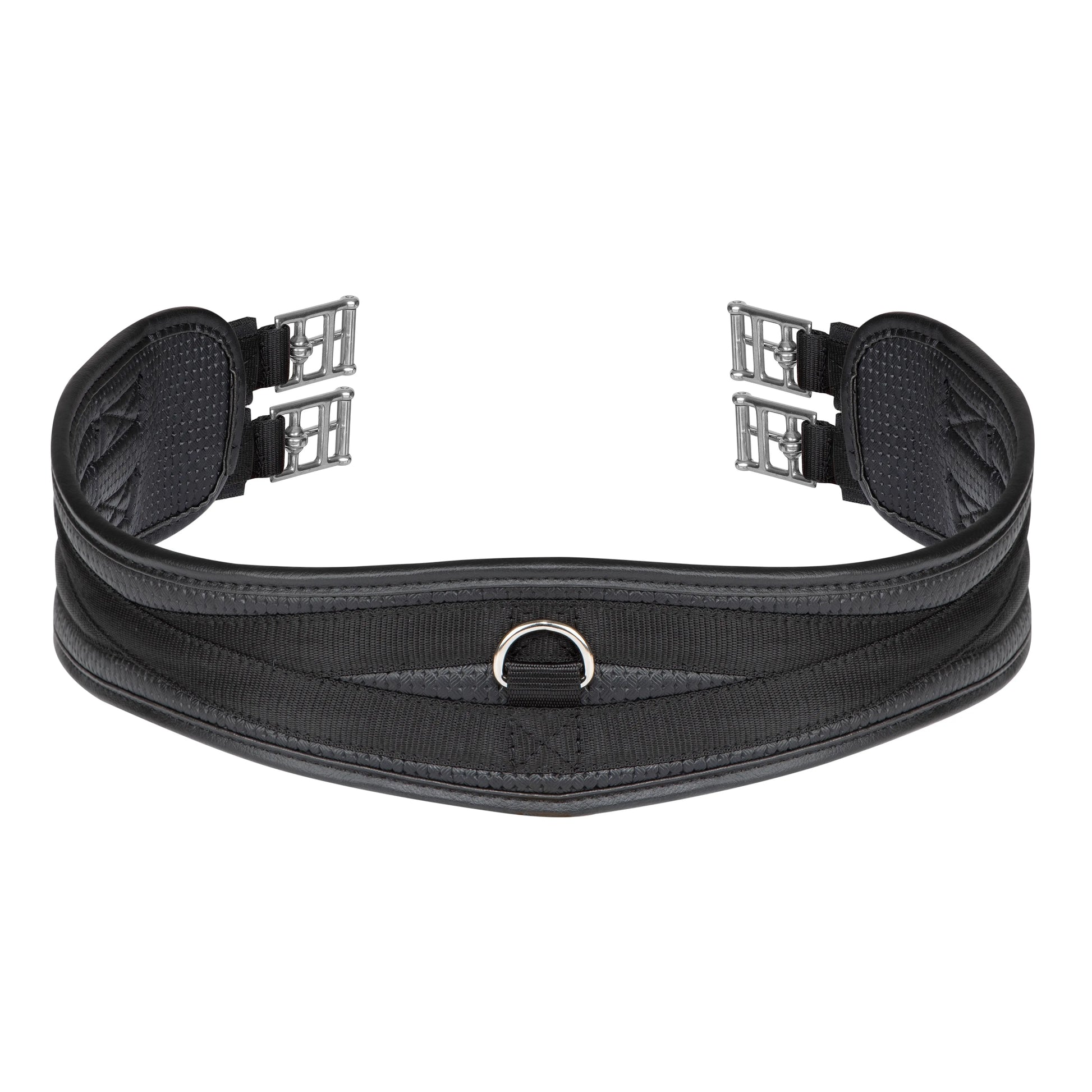 The ARMA anti-chafe contour girth is made from durable waffle material that resists moisture build up to protect against chafing. The textured surface reduces friction allowing the girth to glide smoothly and allows airflow to help control excessive sweat build up. Moisture resistant fabric stays soft and flexible. Anatomic contour shaping allows greater freedom of movement behind the elbows and helps distribute pressure. Flexible, stretch resistant and wipe clean, reinforced with non-stretch nylon webbing. Pressure alleviating elastic inserts at both ends. Stainless steel roller buckles and fittings for long lasting performance.