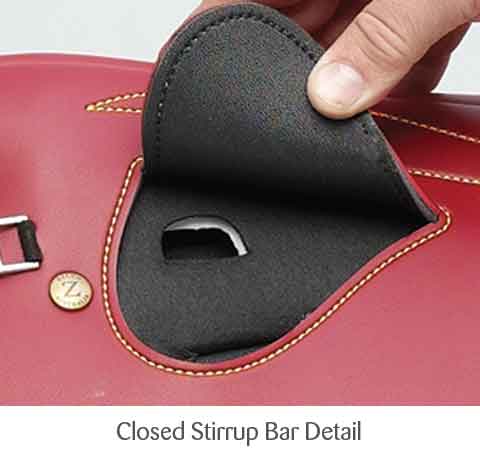 This range of patent finish race saddles are shorter at the front to accommodate current riding style trends. The deeper flap offers better coverage of the girth buckle when the horse is saddled.